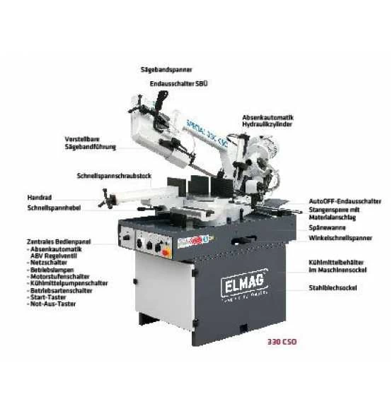 – CSO bzw. M/S-Modell- ABV Absenkautomatik mit Regelventil- SSS Schnellspannschraubstock- Schnellspannhebel- Stangensperre mit Materialanschlag- WSS Winkelschnellspanner- Winkelskala- Kompaktgetriebe mit Ölfüllung- Zentrales Bedien- bzw. Steuerpanel- ERGO-Bedienhebel / Ein/Aus- Kühlsystem mit Elektropumpe- Sägebandräder mit Präzisionslagern- Sägeband-Spureinstellung- Sägebandspanner- SBÜ Sägebandüberwachung Endausschalter- Sägebandführung vorne verstellbar- Spannlager vorne/hinten einstellbar- Späneabstreifer und Spänebürste- Greifschutz- Sägebandschutz mit Endausschalter- AutoOFF-Abschaltautomatik- Not-Aus / Nullspannungsauslösung- Sägerahmen mit Kegelrollenlagern- Stahlblechsockel mit Spänewanne- Bandsägeblatt Bimetall Cobalt- Werkzeug/Betriebsanleitung/CE